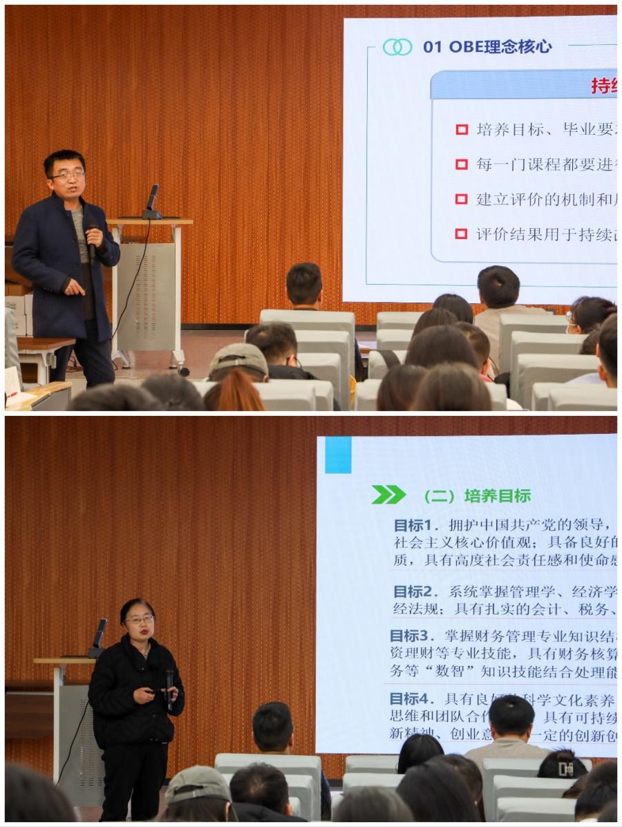 研討會上,趙坤院長立足審核評估政策和要求,基于“產(chǎn)出導(dǎo)向”育人育才人才培養(yǎng)體系開展集中研討。各專業(yè)教師代表針對所在專業(yè)的本科人才培養(yǎng)情況展開匯報。市場營銷專業(yè)負責人魏書峰老師介紹了市場營銷專業(yè)的專業(yè)特點、特色方向、師資結(jié)構(gòu)、科研成績等情況,并基于OBE理念對人才培養(yǎng)方案進行了細致講解。財務(wù)管理專業(yè)負責人楊虹偉老師介紹了財務(wù)管理專業(yè)的專業(yè)定位、培養(yǎng)目標和專業(yè)建設(shè)成效,強調(diào)要提高專業(yè)建設(shè)內(nèi)涵,加強協(xié)同育人平臺建設(shè)。財務(wù)管理系段革花老師以《基礎(chǔ)會計》為例,詳細解讀了該課程的教學大綱和教學設(shè)計。