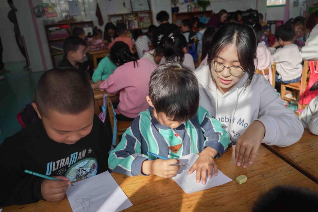 志愿者們通過課件向小朋友們講述秋天的特點和秋天的美麗之處,還給孩子們展示了大自然中各種形狀的樹葉和各種景物的照片,進一步引導(dǎo)孩子們展開想象,盡情討論,一些孩子們迫不及待的拿起畫筆開始創(chuàng)作。志愿者講解過程中與小朋友積極互動,中間穿插相關(guān)動畫放映,小朋友們也熱情回應(yīng)。