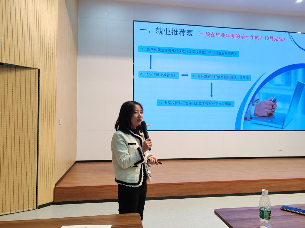 張亞紅老師分別從當(dāng)前高校畢業(yè)生就業(yè)形勢,畢業(yè)生的主要工作去向、畢業(yè)季求職準(zhǔn)備、畢業(yè)生就業(yè)權(quán)益的保障四個方面進(jìn)行闡述,全面地介紹了畢業(yè)生在求職階段的注意事項(xiàng)。之后,張老師根據(jù)畢業(yè)生的就業(yè)情況,將畢業(yè)生主要去向分為了就業(yè)推薦表的流程、生源信息核對流程、網(wǎng)上簽約時間和流程,以及錄入省外就業(yè)協(xié)議書和其他去向登記,使畢業(yè)生對就業(yè)流程更加清晰明了。