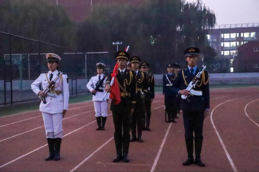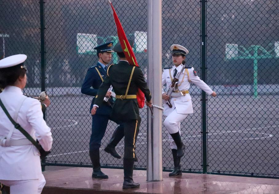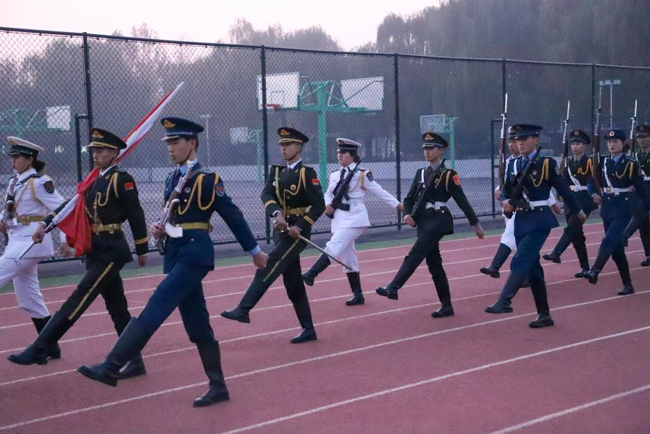 儀式在威嚴的旋律中拉開帷幕,面向著朝陽升起的方向,商學院(國際學院)兄弟連北校區(qū)中隊國旗分隊成員邁著整齊劃一的步伐來到了國旗臺下,全場一片肅靜。在激昂的《義勇軍進行曲》中,升旗手振臂一揮,鮮艷的五星紅旗徐徐展開,全場師生莊嚴肅立,面向鮮艷的五星紅旗行注目禮,五星紅旗在晨曦中迎風飄揚。