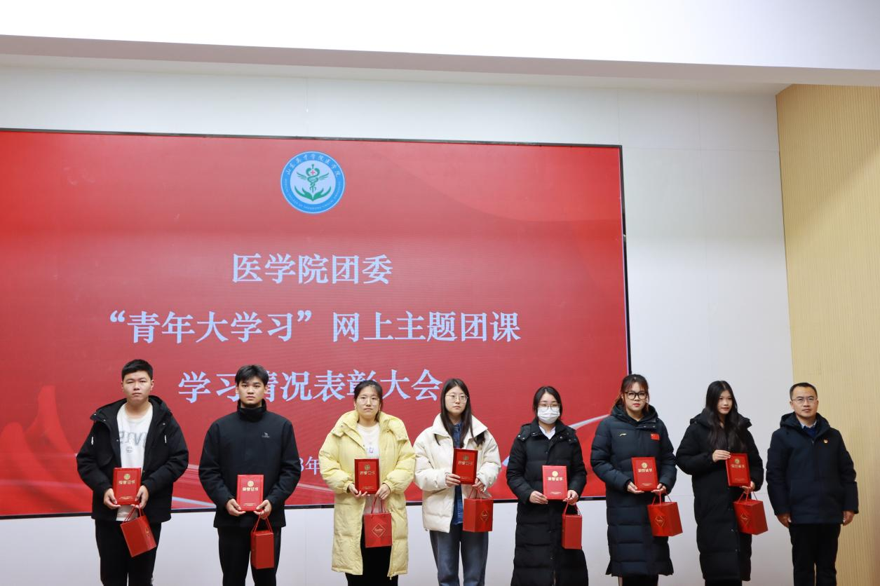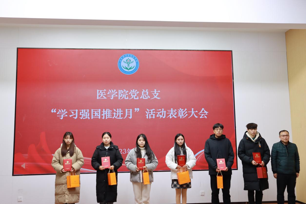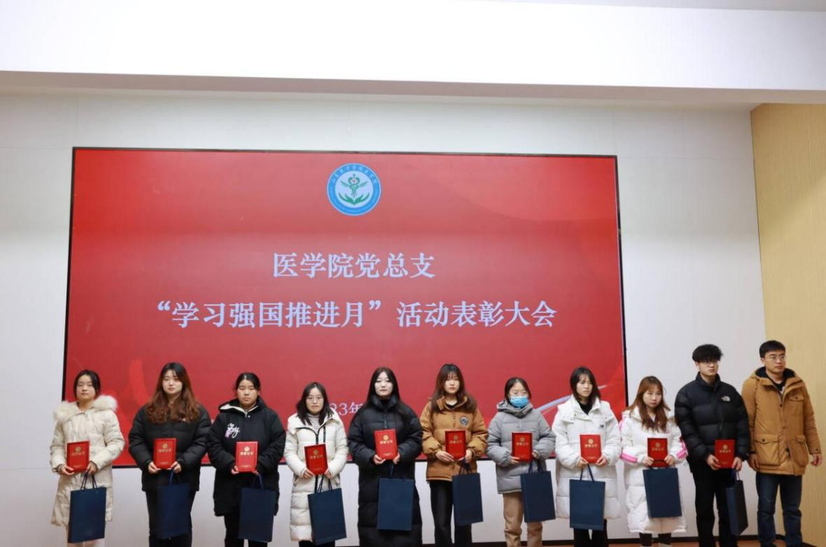 為深入貫徹學(xué)習(xí)黨的二十大精神,激發(fā)醫(yī)學(xué)院學(xué)生參與“學(xué)習(xí)強(qiáng)國(guó)”學(xué)習(xí)平臺(tái)與“青年大學(xué)習(xí)”主題團(tuán)課的熱情、加大“學(xué)習(xí)強(qiáng)國(guó)”推廣使用力度、提高學(xué)生思想政治素養(yǎng)。12月11日,醫(yī)學(xué)院黨總于12月11日在報(bào)告廳召開(kāi)“學(xué)習(xí)強(qiáng)國(guó)推進(jìn)月”暨“青年大學(xué)習(xí)”表彰大會(huì),對(duì)表現(xiàn)優(yōu)異的班級(jí)同學(xué)與老師進(jìn)行表彰,用榜樣力量進(jìn)一步帶動(dòng)同學(xué)們學(xué)習(xí)學(xué)習(xí)強(qiáng)國(guó)與青年大學(xué)習(xí)積極性。本次活動(dòng)由醫(yī)學(xué)院黨總支副書(shū)記武玉興、組織員張巧梅、團(tuán)委書(shū)記劉晴、年級(jí)長(zhǎng)張亞紅、張龍、李振參與指導(dǎo),醫(yī)學(xué)院全體輔導(dǎo)員老師及班級(jí)代表參加,張巧梅老師主持。