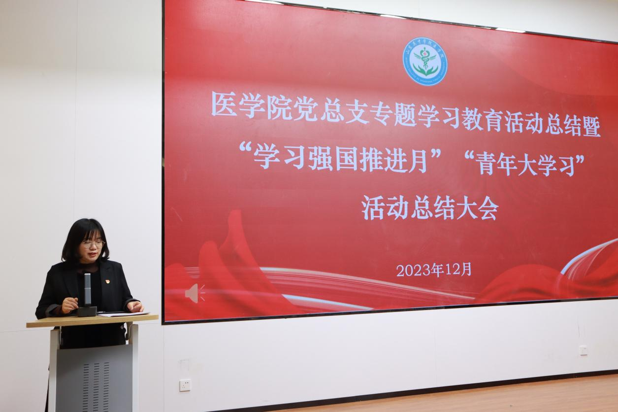 醫(yī)學(xué)院團(tuán)委書(shū)記劉晴宣讀《關(guān)于醫(yī)學(xué)院黨總支專題學(xué)習(xí)教育活動(dòng)總結(jié)暨“學(xué)習(xí)強(qiáng)國(guó)推進(jìn)月”“青年大學(xué)習(xí)”主題團(tuán)課的表彰決定》,希望同學(xué)們能戒驕戒躁,再接再厲,以他們?yōu)榘駱?,自覺(jué)學(xué)習(xí)、深入學(xué)習(xí)、持續(xù)學(xué)習(xí),讓學(xué)習(xí)成為常態(tài),將理論學(xué)習(xí)融入日常,真正在學(xué)思踐悟中凝聚起奮進(jìn)的力量!