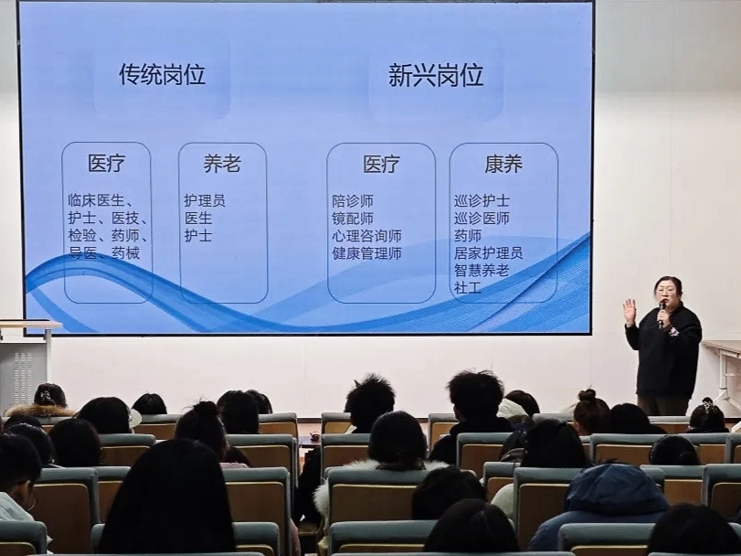 衛(wèi)人云職業(yè)生涯規(guī)劃師王瑩向?qū)W生們分享了當(dāng)前公立三甲醫(yī)院、企業(yè)事業(yè)單位的招聘現(xiàn)狀,同時(shí)為大家講解了近年來在護(hù)理、康復(fù)方面的新興崗位,并從崗位需求、發(fā)展前景、福利待遇、行業(yè)現(xiàn)狀和實(shí)際用人需求方面進(jìn)行了深入詳細(xì)地分析,讓同學(xué)們了解了在新時(shí)代背景下,大學(xué)生如何定位自我。