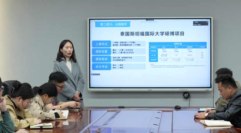 劉珈宜老師以“千川匯海闊·風(fēng)正好揚(yáng)帆”為題,全面分析考研相關(guān)規(guī)劃,明確了考研指導(dǎo)工作的目標(biāo)和方向,重點(diǎn)介紹了泰國斯坦福國際大學(xué)碩博項(xiàng)目。