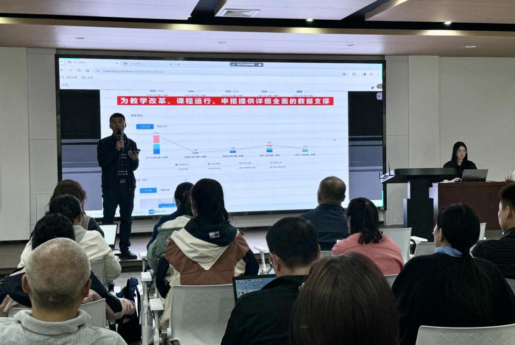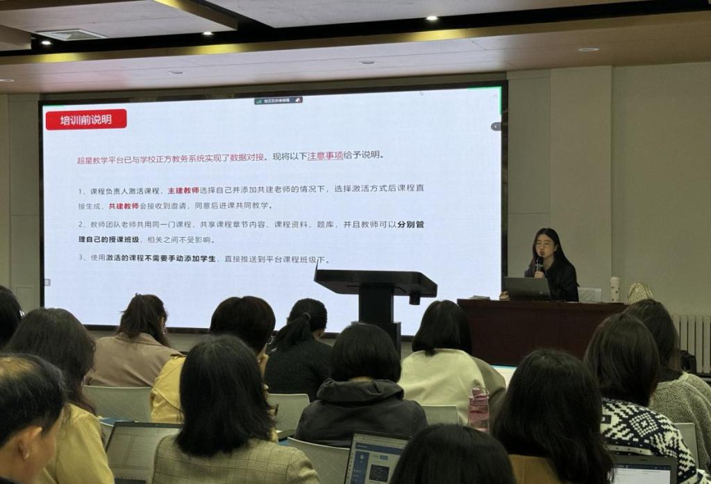 王老師在課程資源建設(shè)、課堂互動(dòng)、線上資源共享等方面展開,引領(lǐng)教師們登錄泛雅網(wǎng)絡(luò)教學(xué)平臺(tái)或移動(dòng)手機(jī)端學(xué)習(xí)通APP,教師可以通過(guò)平臺(tái)進(jìn)行教學(xué)包建課、線上資源共享、教學(xué)互動(dòng)管理、建立科目題庫(kù)等打造在線課程,實(shí)現(xiàn)智能化教學(xué)改革創(chuàng)新?,F(xiàn)在模擬演示了使用“超星”平臺(tái)開展教學(xué)點(diǎn)名、引用視頻、數(shù)據(jù)分析、建造資源庫(kù)等教學(xué)功能,老師們拿起手機(jī)興致勃勃參與其中,在現(xiàn)場(chǎng)切身感受到智慧教學(xué)輔助工具的教學(xué)效果和互動(dòng)效果。