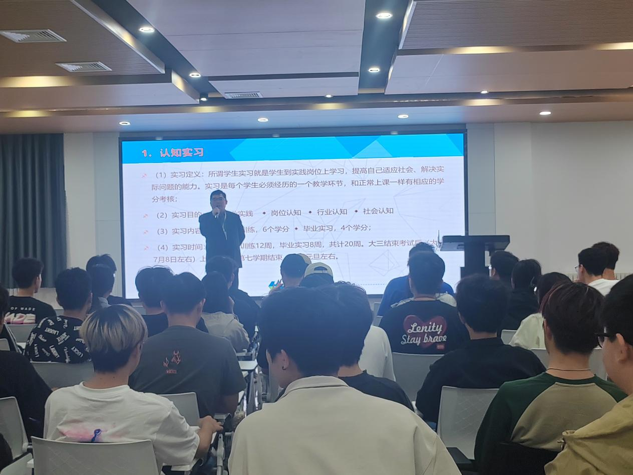 大會(huì)伊始,廉立生老師認(rèn)為:實(shí)習(xí)就是在實(shí)踐中學(xué)習(xí),這是一種高效率、能夠全面提升實(shí)踐技能、鍛煉學(xué)生綜合素養(yǎng)的高級(jí)學(xué)習(xí)形式。一方面可以檢驗(yàn)理論學(xué)習(xí)的效果,另一方面幫助同學(xué)們儲(chǔ)備職場(chǎng)認(rèn)知,鍛煉職場(chǎng)自我生存能力。接著,從實(shí)習(xí)認(rèn)知、實(shí)習(xí)安置、實(shí)習(xí)管理、實(shí)習(xí)考核四個(gè)方面向同學(xué)們講解了實(shí)習(xí)對(duì)學(xué)生個(gè)人成長(zhǎng)和職業(yè)生涯發(fā)展的重要性,強(qiáng)調(diào)了實(shí)習(xí)期間的紀(jì)律要求和安全注意事項(xiàng)。