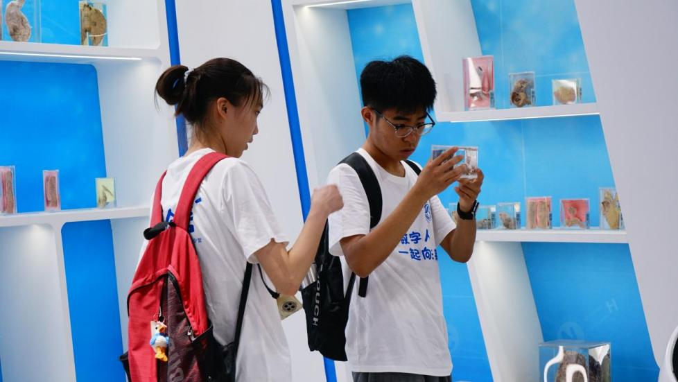 在胚胎發(fā)育展區(qū),呈現(xiàn)了精子進(jìn)入卵細(xì)胞的情景,學(xué)生們通過數(shù)字化交互平臺了解到受精過程、分娩過程、畸形胚胎原因等知識;在“精妙人體”展區(qū),系統(tǒng)地展示了人體各組織器官的結(jié)構(gòu)和功能,通過抽象的藝術(shù)設(shè)計模型,將人體的“九大系統(tǒng)”緊密聯(lián)系在一起。除此之外,學(xué)生們還觀察了3D打印技術(shù)制作的醫(yī)學(xué)模型,領(lǐng)略了3D打印技術(shù)的精準(zhǔn)與高效,感受了虛擬現(xiàn)實技術(shù)帶來的沉浸式解剖學(xué)習(xí)體驗。展館虛實結(jié)合,實現(xiàn)了前沿科學(xué)技術(shù)在醫(yī)學(xué)教育、科學(xué)知識普及中的應(yīng)用,不僅提高了觀覽體驗,也探索了醫(yī)學(xué)教育數(shù)字化的轉(zhuǎn)型之路。