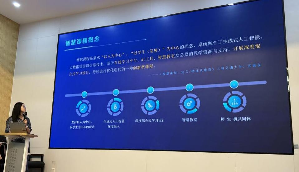 培訓(xùn)會(huì)上,付老師首先介紹了人工智能在高等教育領(lǐng)域的應(yīng)用現(xiàn)狀,并強(qiáng)調(diào)了智慧教學(xué)對(duì)于推動(dòng)教育創(chuàng)新的重要性,它借助大數(shù)據(jù)、人工智能(AI)技術(shù)等前沿技術(shù),實(shí)現(xiàn)了教學(xué)資源的優(yōu)化配置和教學(xué)過(guò)程的智能化管理。隨后,付老師圍繞智慧課程政策導(dǎo)向、智慧課程建設(shè)流程、知識(shí)圖譜建設(shè)步驟以及AI賦能智慧課程等方面進(jìn)行了詳細(xì)闡述。