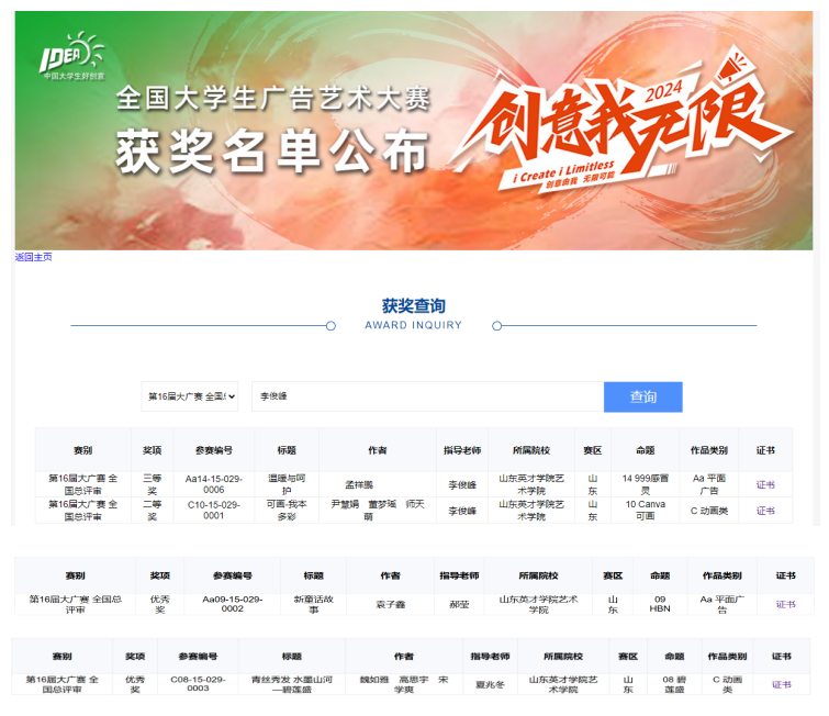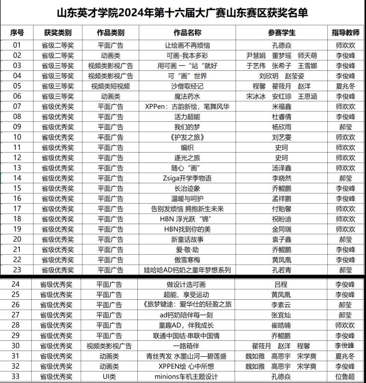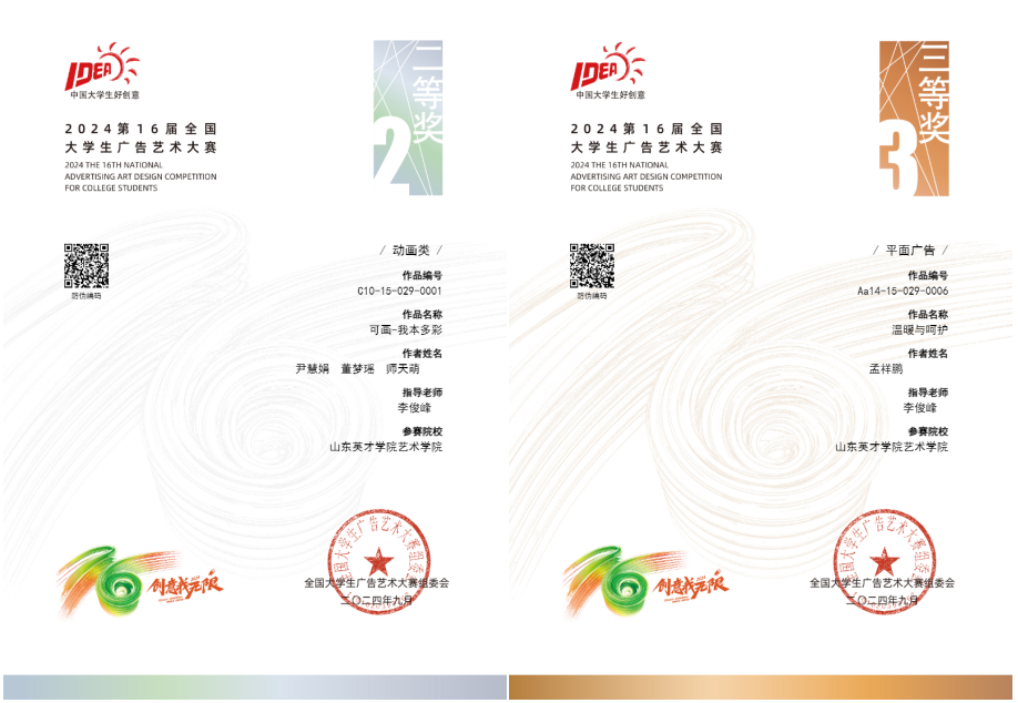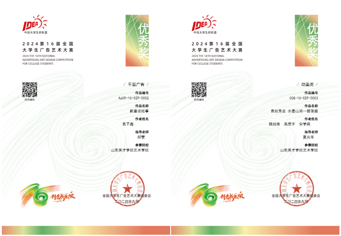2024年9月9日,第十六屆全國大學(xué)生廣告藝術(shù)大賽(簡(jiǎn)稱“大廣賽”)全國總評(píng)審結(jié)果揭曉,山東英才學(xué)院設(shè)計(jì)學(xué)院的學(xué)子們?cè)诖舜未筚愔?,憑借扎實(shí)的專業(yè)知識(shí)、獨(dú)特的創(chuàng)意和出色的表現(xiàn),從眾多參賽作品中脫穎而出,斬獲佳績(jī)。榮獲國家級(jí)、省級(jí)獎(jiǎng)項(xiàng)總計(jì)37項(xiàng)。榮獲國家級(jí)獎(jiǎng)項(xiàng)4項(xiàng),其中二等獎(jiǎng)1項(xiàng),三等獎(jiǎng)1項(xiàng)、優(yōu)秀獎(jiǎng)2項(xiàng)。與往年的獲獎(jiǎng)情況相比,此次獲獎(jiǎng)在含金量、數(shù)量以及專業(yè)領(lǐng)域等方面均實(shí)現(xiàn)了重大突破!