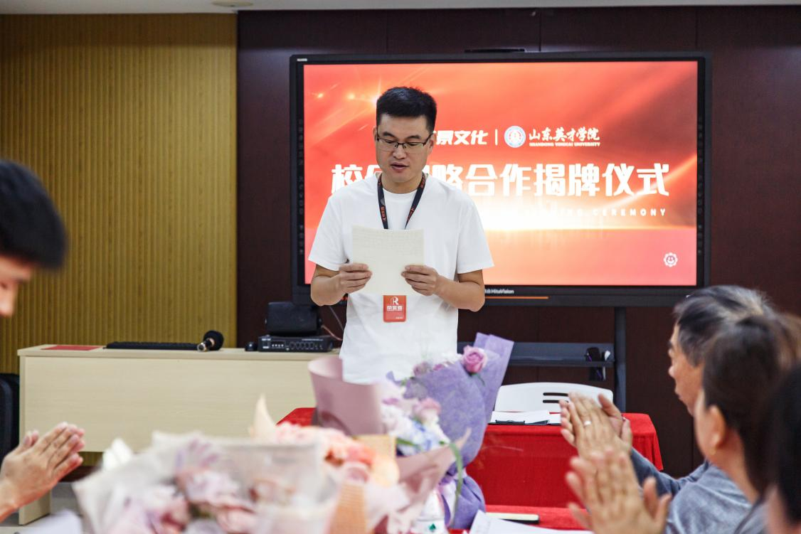 儀式上,溫州博景文化有限公司董事長(zhǎng)陳云超對(duì)我院領(lǐng)導(dǎo)、老師的到來(lái)表示歡迎并發(fā)表了致辭。他表示在文創(chuàng)產(chǎn)品需求日益多樣化、個(gè)性化的當(dāng)下,設(shè)計(jì)作為產(chǎn)品靈魂和企業(yè)前行核心動(dòng)力的重要性愈發(fā)凸顯,此次合作是理論與實(shí)踐深度融合的典范,是產(chǎn)業(yè)與教育雙贏模式的積極探索。通過(guò)此次合作,企業(yè)將深度參與學(xué)院人才培養(yǎng),為學(xué)生提供實(shí)踐機(jī)會(huì),助力其畢業(yè)后迅速適應(yīng)工作崗位,實(shí)現(xiàn)雙方資源共享、優(yōu)勢(shì)互補(bǔ),共同開(kāi)拓美好未來(lái)。