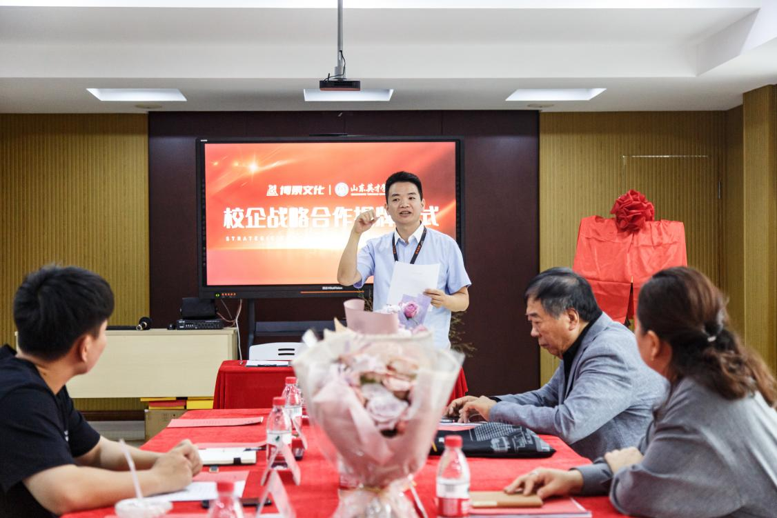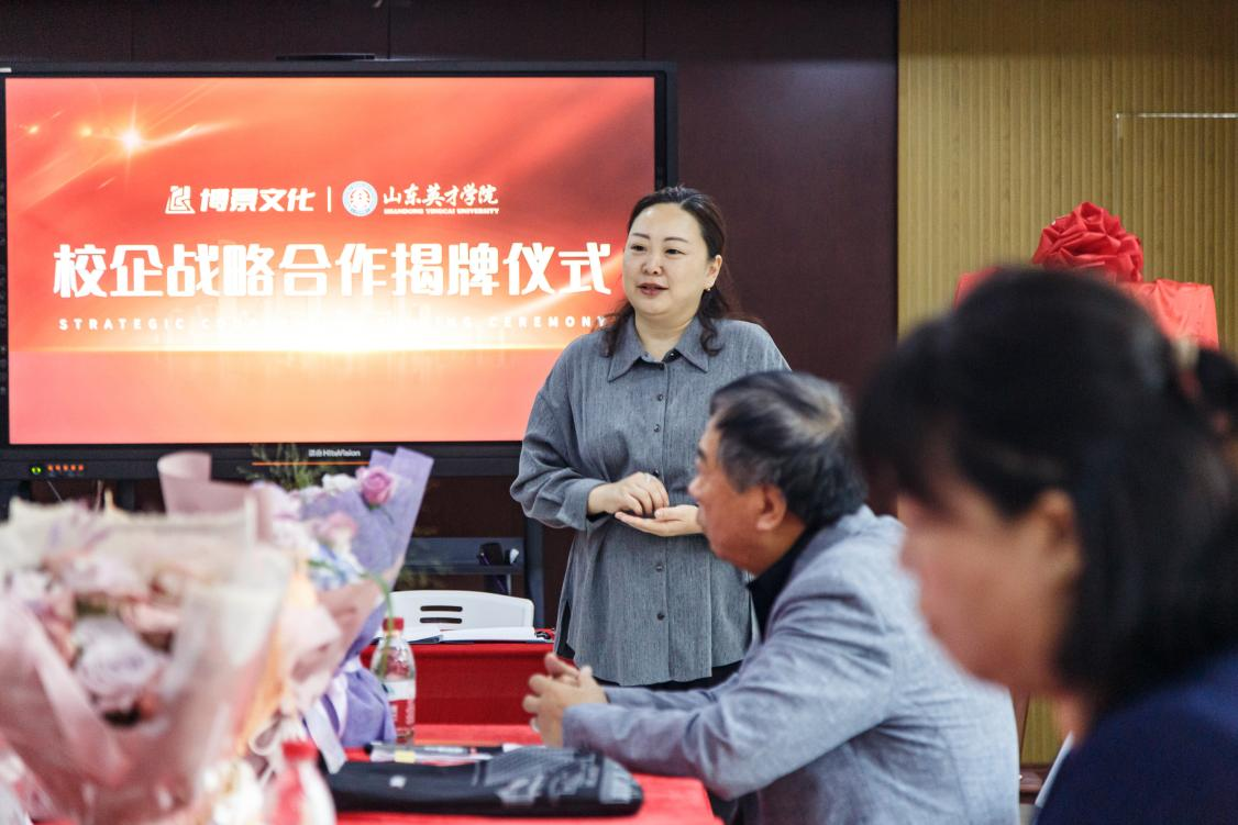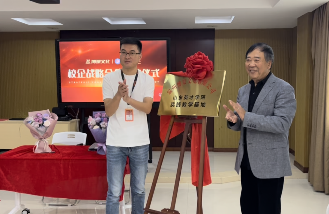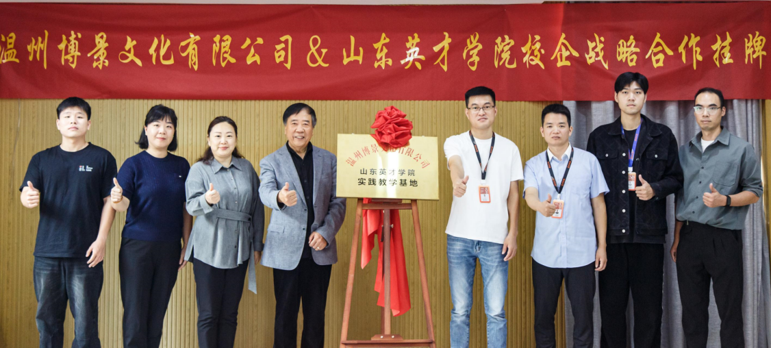 2024 年 10 月 13 日,山東英才學(xué)院設(shè)計(jì)學(xué)院與溫州博景文化有限公司校企合作簽約暨揭牌儀式成功舉行。溫州博景文化有限公司董事長(zhǎng)陳云超,副總經(jīng)理陳建信,人事行政經(jīng)理金揚(yáng)科,設(shè)計(jì)總監(jiān)梅成龍、林思楠,設(shè)計(jì)學(xué)院院長(zhǎng)周長(zhǎng)積,教學(xué)副院長(zhǎng)郝瑩,數(shù)字媒體負(fù)責(zé)人李俊峰共同參與活動(dòng)。