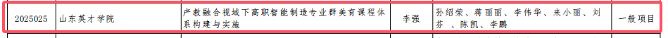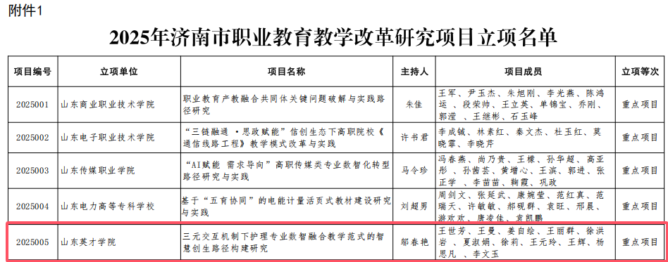 近日,濟(jì)南市教育局正式公布2025年職業(yè)教育教學(xué)改革研究項(xiàng)目立項(xiàng)名單,我校申報(bào)的兩個(gè)項(xiàng)目成功獲批。其中,鄔春艷老師主持的《三元交互機(jī)制下護(hù)理專業(yè)數(shù)智融合教學(xué)范式的智慧創(chuàng)生路徑構(gòu)建研究》獲批重點(diǎn)項(xiàng)目,李強(qiáng)老師主持的《產(chǎn)教融合視域下高職智能制造專業(yè)群美育課程體系構(gòu)建與實(shí)施》獲批一般項(xiàng)目。