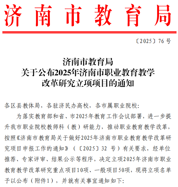 據(jù)悉,濟(jì)南市職業(yè)教育教改項(xiàng)目立項(xiàng)堅(jiān)持正確政治方向,落實(shí)立德樹(shù)人根本任務(wù),緊密對(duì)接國(guó)家及區(qū)域重大戰(zhàn)略、經(jīng)濟(jì)發(fā)展主戰(zhàn)場(chǎng)、濟(jì)南市產(chǎn)業(yè)升級(jí)與高技能人才需求。項(xiàng)目旨在服務(wù)黃河重大國(guó)家戰(zhàn)略、綠色低碳高質(zhì)量發(fā)展及新質(zhì)生產(chǎn)力發(fā)展,聚焦解決濟(jì)南市職業(yè)教育高質(zhì)量發(fā)展的關(guān)鍵問(wèn)題,以提升人才培養(yǎng)質(zhì)量為核心,深化產(chǎn)教融合與校企合作,支持具有創(chuàng)新性和實(shí)踐應(yīng)用價(jià)值的教學(xué)改革研究。本年度全市共立項(xiàng)60項(xiàng),我校憑借扎實(shí)的前期研究基礎(chǔ)和鮮明的教改特色成功入選。