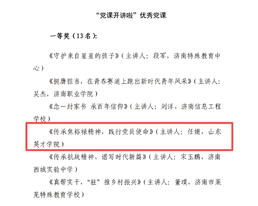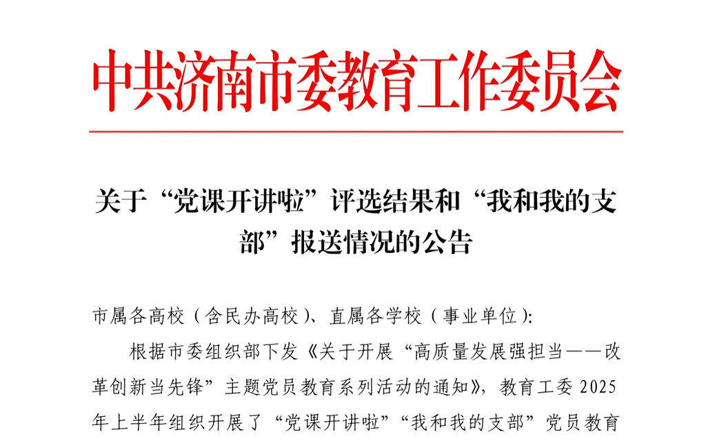 近日,中共濟南市委教育工作委員會公布了“黨課開講啦”活動的評選結果,在此次活動中,我校黨委精心組織、積極參與,報送的作品喜獲佳績,充分展現了我校黨建工作的扎實成效與創(chuàng)新活力。