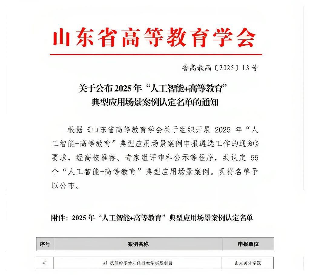 近日,山東省高等教育學會公布了《2025年“人工智能+高等教育”典型應用場景案例認定名單》。我校學前教育學院申報的《AI賦能的嬰幼兒保教教學實踐創(chuàng)新》被認定為2025年“人工智能+高等教育”典型應用場景案例。