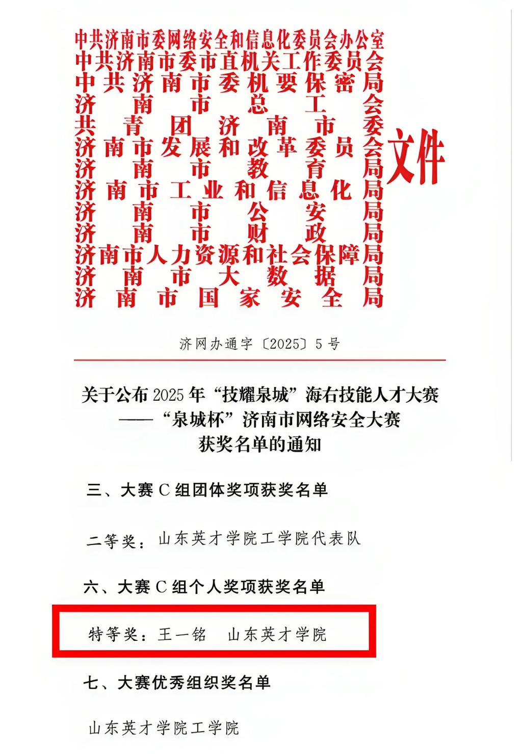 近日,由濟南市委網(wǎng)信辦等多部門聯(lián)合主辦的2025年“技耀泉城”海右技能人才大賽——“泉城杯”濟南市網(wǎng)絡(luò)安全大賽圓滿落幕。我校工學院學子王一銘憑借過硬技術(shù)與穩(wěn)定發(fā)揮,從124支隊伍、42名選手中脫穎而出,勇奪C組個人特等獎,其所在團隊獲C組團體二等獎,學校獲評優(yōu)秀組織獎。