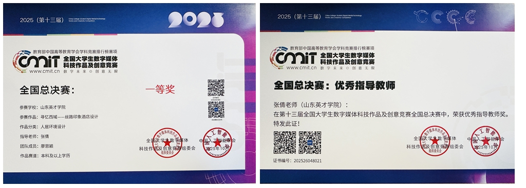 在本次競賽中,山東英才學(xué)院設(shè)計學(xué)院提交了豐富多樣的數(shù)字媒體與科技作品,經(jīng)過激烈角逐,共評選出國家級一等獎1項、國家級三等獎7項,省級一等獎1項、省級二等獎7項、省級三等獎6項,涵蓋環(huán)境設(shè)計、視覺傳達、產(chǎn)品設(shè)計等多個專業(yè)方向。參賽作品主題多元,涉及文化傳承、城市更新、IP設(shè)計、空間營造等領(lǐng)域,充分體現(xiàn)了我校在“藝術(shù)+科技”融合育人方面的扎實成效。