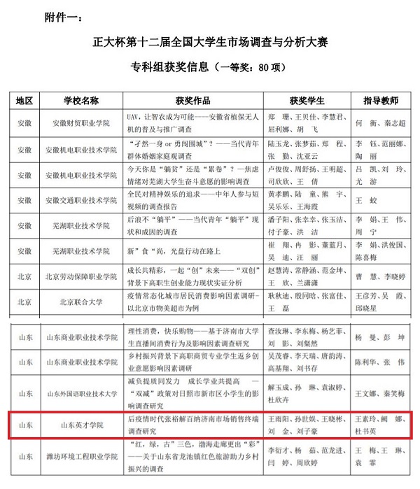 4月30日-5月1日,由中國(guó)商業(yè)統(tǒng)計(jì)學(xué)會(huì)主辦、河南經(jīng)貿(mào)職業(yè)學(xué)院承辦的“正大杯”第十二屆全國(guó)大學(xué)生市場(chǎng)調(diào)查與分析大賽專(zhuān)科組總決賽在線上舉行。總決賽共有來(lái)自92所學(xué)校的162支團(tuán)隊(duì)、543名學(xué)生參加線上展示和答辯。山東英才學(xué)院商學(xué)院參賽團(tuán)隊(duì)參賽作品《后疫情時(shí)代張?jiān)=獍偌{濟(jì)南市場(chǎng)銷(xiāo)售終端調(diào)查研究》獲全國(guó)一等獎(jiǎng)。
