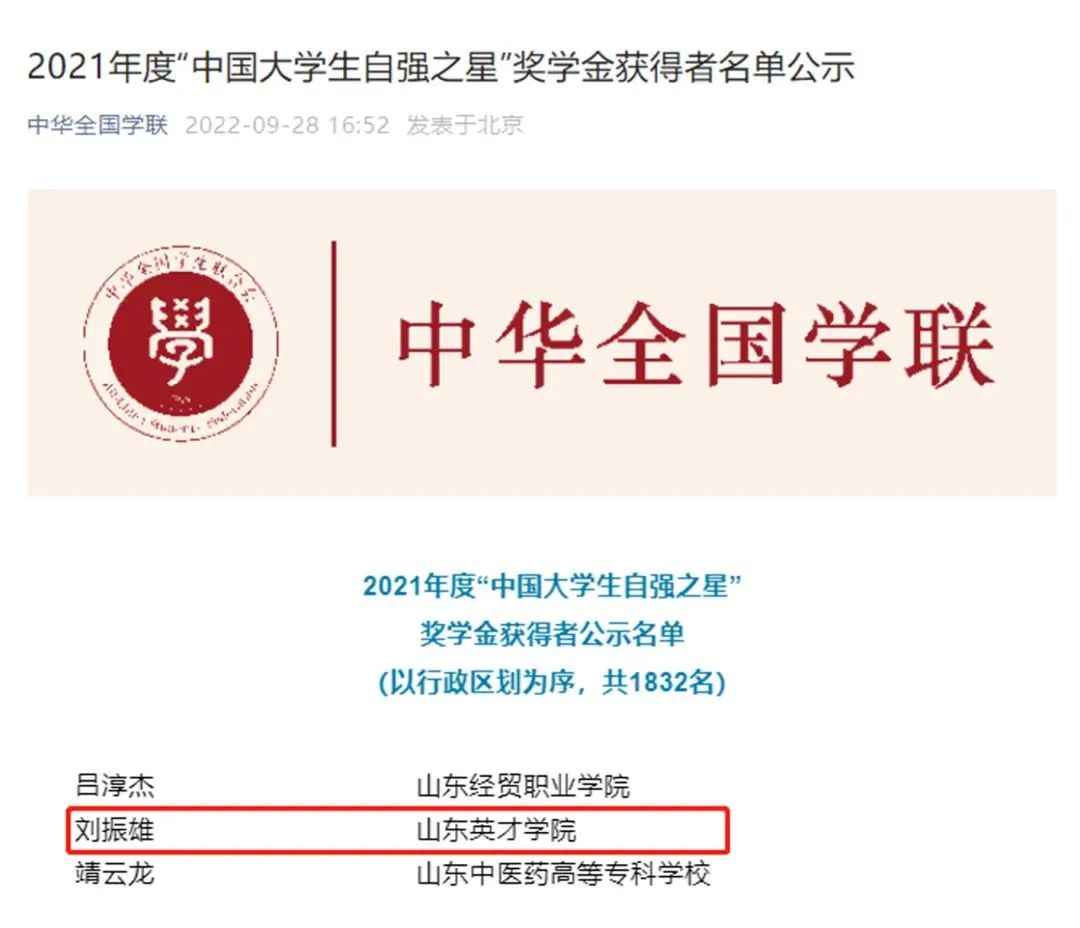 近日,由共青團(tuán)中央、全國學(xué)聯(lián)指導(dǎo),中國青年報(bào)社、新東方教育科技集團(tuán)、中國青年創(chuàng)業(yè)就業(yè)基金會聯(lián)合舉辦的2021年度“中國大學(xué)生自強(qiáng)之星”獎學(xué)金評定活動名單公示。經(jīng)過我校團(tuán)委推薦、省級初選、全國評審等環(huán)節(jié),我校優(yōu)秀學(xué)子劉振雄同學(xué)獲評2021年度“中國大學(xué)生自強(qiáng)之星”。