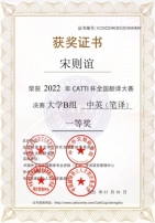 近日,由全國翻譯專業(yè)學位研究生教育指導委員會和中國外文局翻譯院主辦、中國外文局CATTI項目管理中心負責實施的2022年“CATTI杯”全國翻譯大賽各語種全國決賽獲獎名單揭曉。山東英才學院人文學院2020級本科英語專業(yè)學生宋則誼喜獲“CATTI杯”全國翻譯大賽“一等獎”。