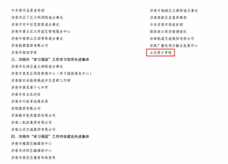 自2019年“學(xué)習(xí)強(qiáng)國(guó)”平臺(tái)推出以來(lái),學(xué)校黨委高度重視、周密部署、持續(xù)緊抓,著力在提升認(rèn)識(shí)、改進(jìn)方式、濃厚氛圍上下功夫見(jiàn)成效,推進(jìn)“學(xué)習(xí)強(qiáng)國(guó)”平臺(tái)學(xué)習(xí)使用在學(xué)校落地生根、開(kāi)花結(jié)果,成為全校師生提升思想政治覺(jué)悟、緊跟時(shí)代步伐的重要平臺(tái)。近日,山東英才學(xué)院獲評(píng)2022年度濟(jì)南市“學(xué)習(xí)強(qiáng)國(guó)”工作內(nèi)容建設(shè)先進(jìn)集體,我校王增燕老師獲評(píng)濟(jì)南市“學(xué)習(xí)強(qiáng)國(guó)”學(xué)習(xí)達(dá)人。