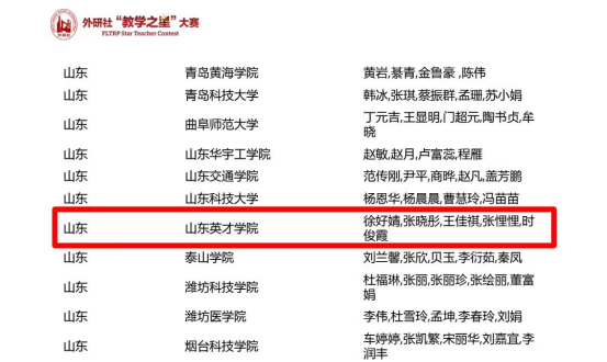 在2023年外研社“教學(xué)之星”大賽中,山東英才學(xué)院人文學(xué)院英語(yǔ)教研室崔丹、蘆芳芳、周曉麗、陳楠教師團(tuán)隊(duì)榮獲全國(guó)復(fù)賽特等獎(jiǎng);公共英語(yǔ)教研室徐好婧、張曉彤、王佳祺、張悝悝、時(shí)俊霞教師團(tuán)隊(duì)榮獲全國(guó)復(fù)賽二等獎(jiǎng)。