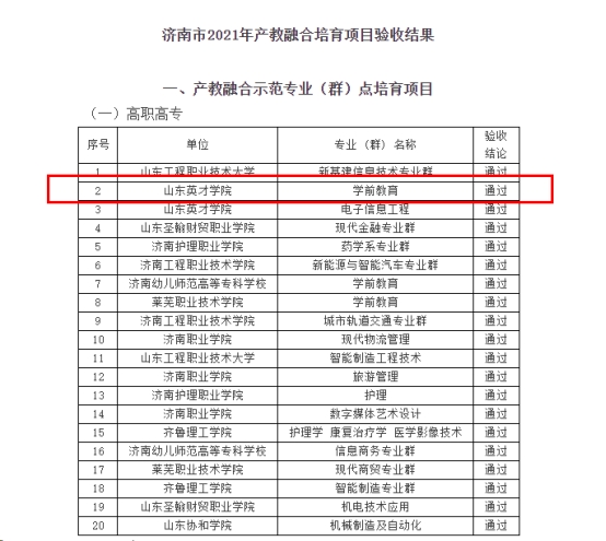 學前教育學院2021年立項的學前教育專業(yè)產(chǎn)教融合示范專業(yè)群(點)培育項目,通過為期2年的建設,經(jīng)濟南市教育局組織專家鑒定,順利通過了濟南市產(chǎn)教融合試點培育項目的驗收。
