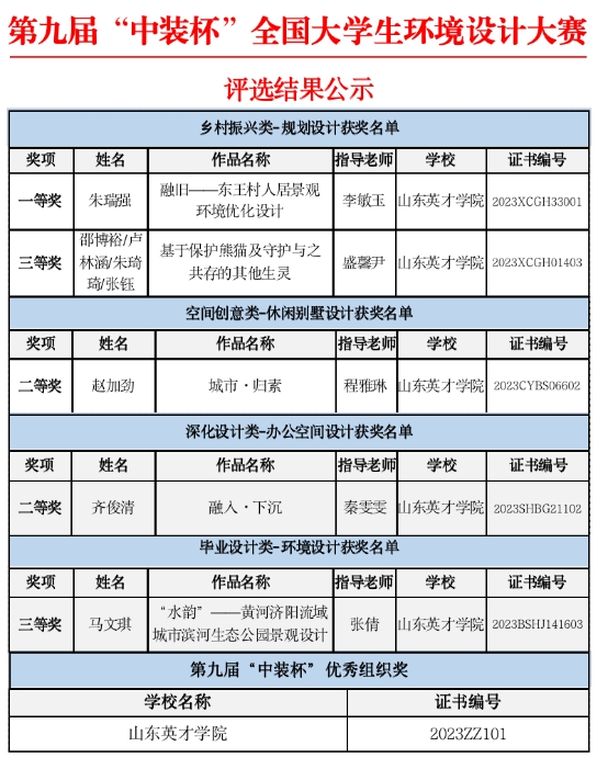 本次競(jìng)賽經(jīng)過山東英才學(xué)院設(shè)計(jì)學(xué)院積極動(dòng)員組織學(xué)生參賽,最終經(jīng)過大賽組委會(huì)大賽初審、復(fù)審、終審角逐出最終獲獎(jiǎng)作品,共計(jì)獲獎(jiǎng)5項(xiàng)的好成績: