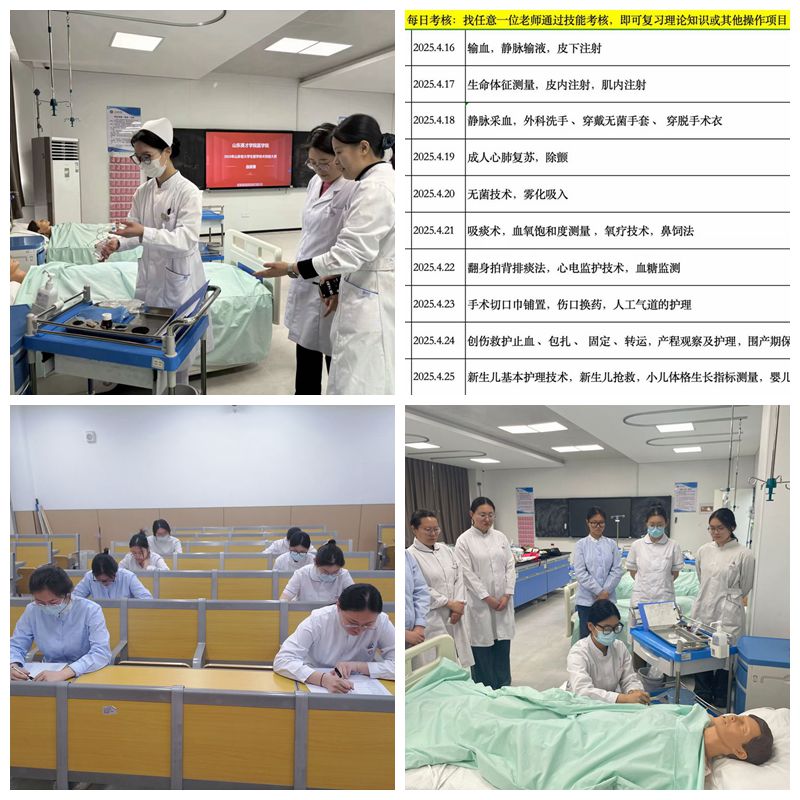 優(yōu)異成績的取得,離不開醫(yī)學院指導團的精心策劃與悉心指導。為備戰(zhàn)2025年山東省大學生醫(yī)學技術技能大賽,醫(yī)學院成立指導小組,由基礎護理教研室的王玉珍、劉敏、朱珊璘、吳金雪老師組成,進行了為期約兩個月的緊張備考。
